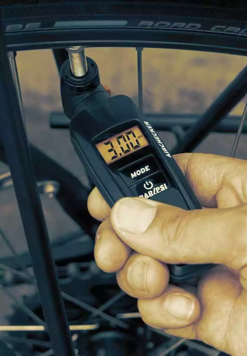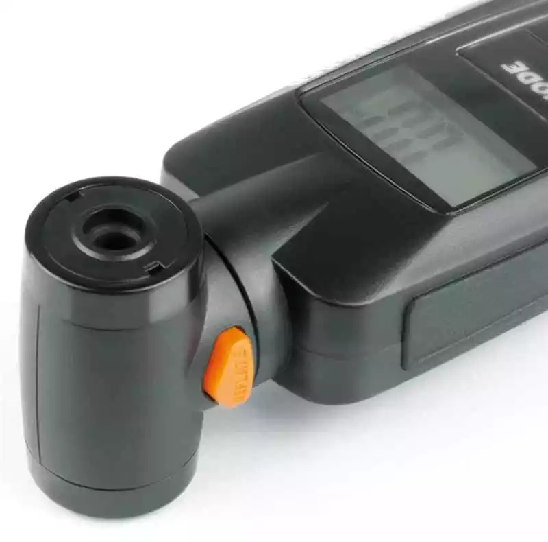 Die Druckanzeige ist zwischen Bar und PSI umschaltbar. Über die orange Taste kann der Luftdruck, bei permanenter Echtzeitmessung, sehr fein auf den gewollten Wert abgesenkt werden. Für eine Echtzeitmessung muss vorgängig die Mode-Drucktaste betätigt werden.