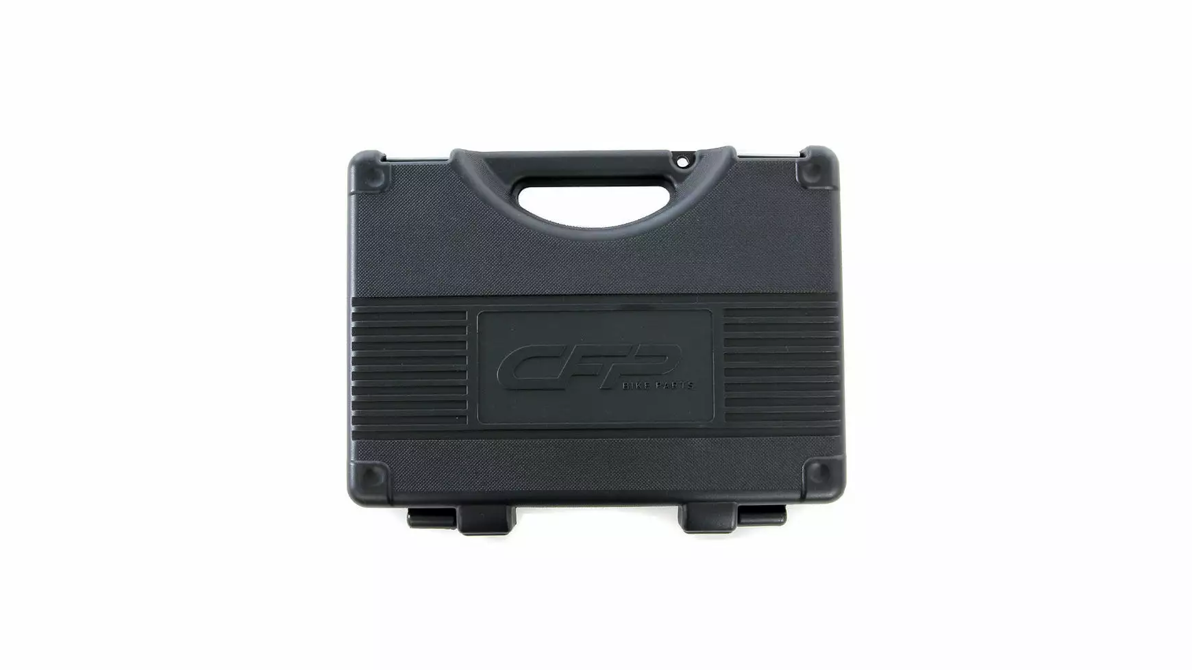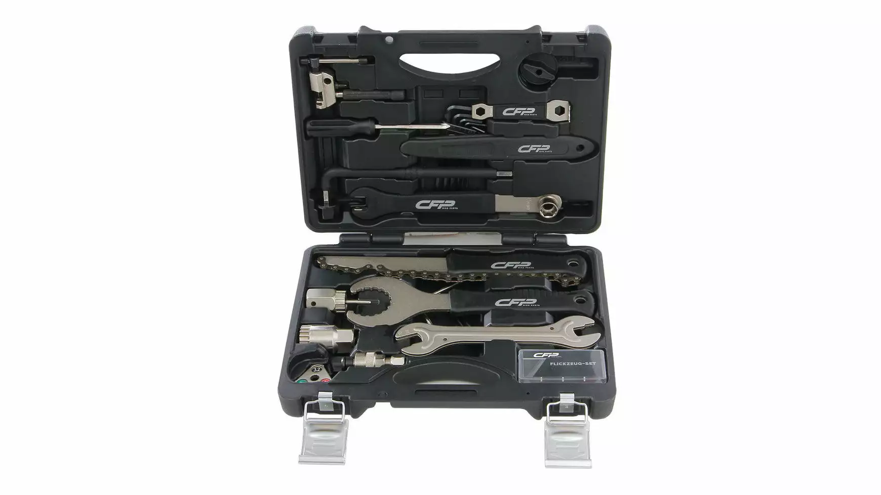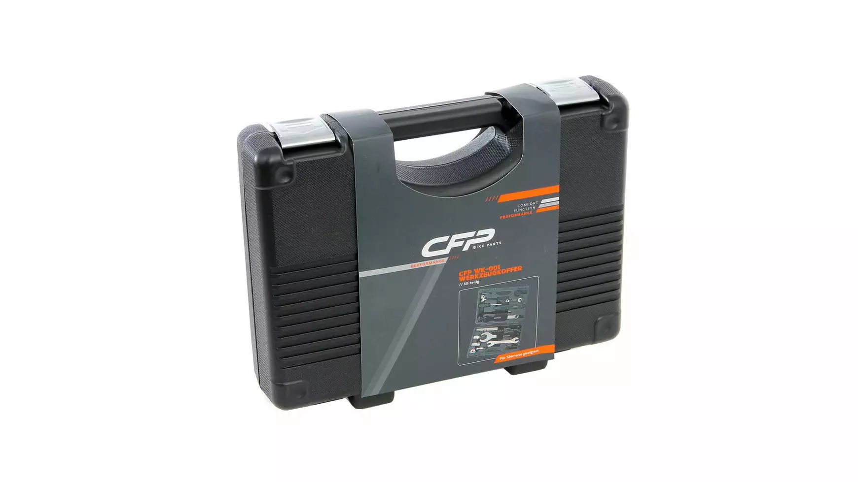 Der CFP WK-001 Werkzeugkoffer ist mit seinen 18 umfangreichen- und hochwertigen Werkzeugen unverzichtbar für die Hobbywerkstatt oder für Unterwegs. Im Koffer enthalten: Kettennietdrücker für 7-/8-/9- und Shimano 10-/ 11-fach Ketten, 5mm Schlitz- und PH2 Kreuzschlitzschraubendreher, Staubkappenschlüssel, Kettenblattschraubenschlüssel, Reifenheber, 8mm Innensechskant Winkelschraubendreher mit 1/2″ Antrieb, Freilauf- und Kassettenverschlussringabzieher 1/2 Zoll Antrieb (auch für Shimano Centerlock® Bremsscheiben), Cartridgetretlager- Steckschlüsseleinsatz 1/2″ Antrieb, Pedalschlüssel SW 15mm mit Steckschlüsseleinsatz SW 14 mm,Konusschlüssel 1 Paar SW 13/14 und 1 Paar SW 15/16mm, Tretlagerschlüssel Hollowtech II®, Kurbelabzieher M20x1mm für Vierkantkurbeln, Speichenschlüssel 3,2/ 3,3/ 3,5mm, Schlitzschraubendreher 3 mm, T 25 Torx- Winkelschraubendreher, Innensechskant Winkelschraubendreherset 2/2,5/3/4/5/6 mm