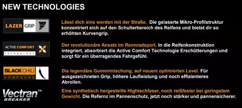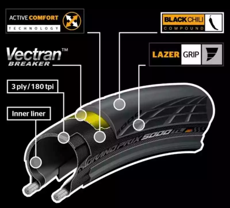 Die Neuauflage des beliebtesten Rennveloreifen weltweit – der GRAND PRIX 5000. In Punkto Rollwiederstand, hohe Laufleistung, Geschwindigkeit und hohen Pannenschutz wurde nochmals einen obendrauf gesetzt. 12% weniger Rollwiderstand, 20% mehr Pannenschutz und 10% leichter als sein Vorgänger GP 4000 S II. Die Hightech-Gummimischung „Black-Chilli“, bestehend aus Kautschuken in Form von Nanopartikeln, ermöglichen beste Rollwerte. Interessant ist auch der gut funktionierende Pannenschutz in dieser Gewichtsklasse der Leichtbau-Reifen. Der revolutionäre Schutzgürtel aus Vectran, einem thermoplastischen mehrfaserigen Garn, ist besonders leicht, extrem belastbar, ermüdungsresistent und sogar fünfmal stärker als Stahl. Der GRAND PRIX 5000 ist die eierlegende Wollmilchsau und überzeugt durch und durch… Für Training und Wettkampf!(D)