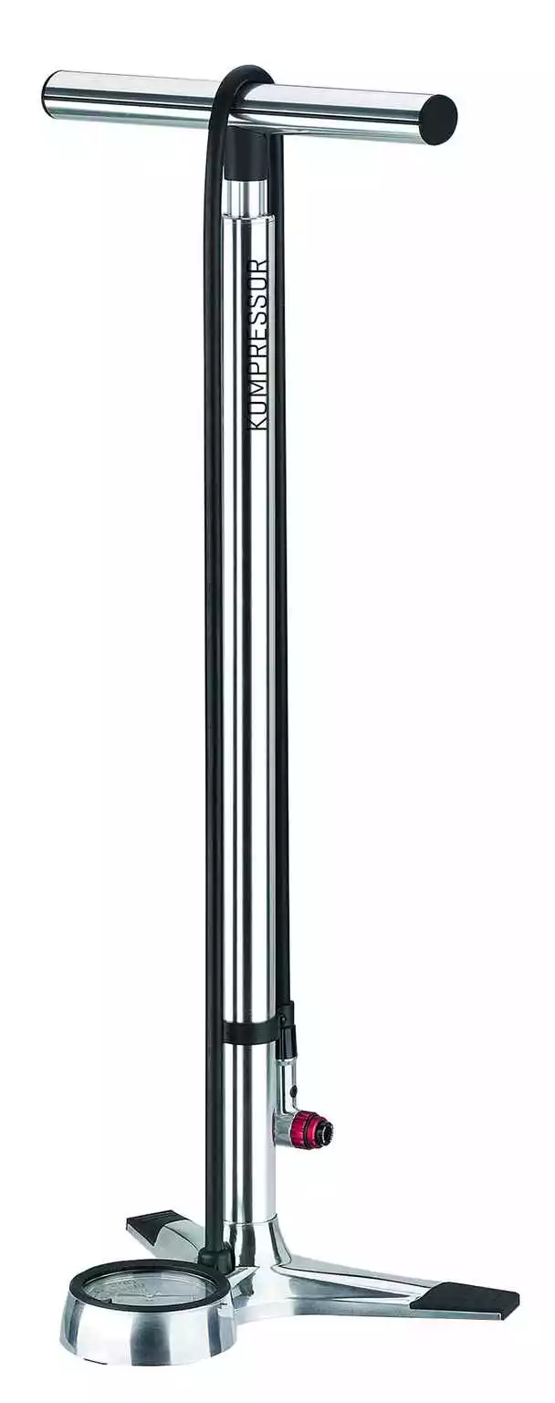 Hochwertige, ganz aus Alu gefertigte Standpumpe mit hohem Schöpfvolumen, die Rennveloreifen genau so effizient füllt wie grossvolumige MTB-Reifen.