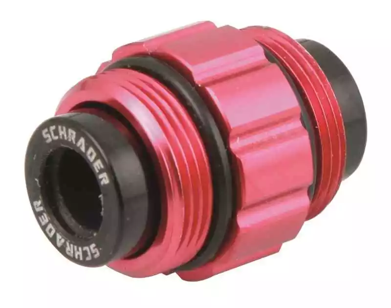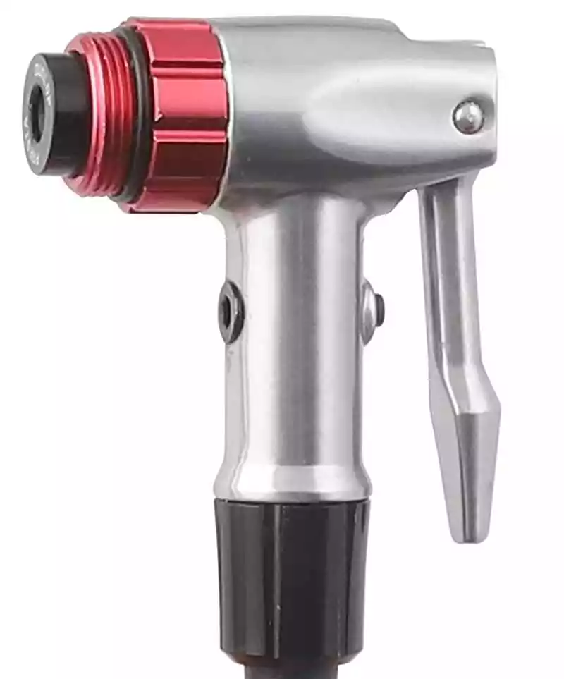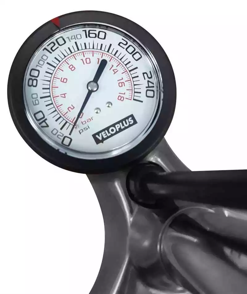 Der Pumpadapter mit Spannhebel ist wertig ganz aus Alu gefertigt und befüllt Schläuche mit Presta-, Dunlop- oder Schrader-Ventilen. Bei Wechsel von einem auf den anderen Ventiltyp muss nur das rote Adapterteil um 180° gewendet werden, was innert weniger Sekunden getan ist. Das stosssicher im Fuss eingelassene Manometer ist mit einem Durchmesser von 3″ (7.5cm) sehr gut ablesbar. (RC)