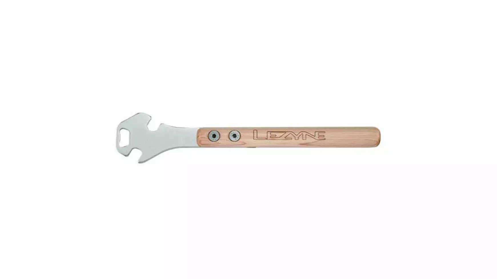 Hochwertiger Pedalschlüssel in Werkstattqualität. Entworfen mit zwei 15mm Schraubenschlüsselöffnungen für optimale Hebelwirkung und leichte Nutzung. Der Werkzeugkopf ist aus einer geprägten, CNC-gefrästen und hitzebehandelten Stahlplatte hergestellt und verfügt außerdem über einen integrierten Flaschenöffner. Ein optimal geformter und mit lackiertem Holz versehener Griff sorgt für den klassischen Look und perfekten Grip.