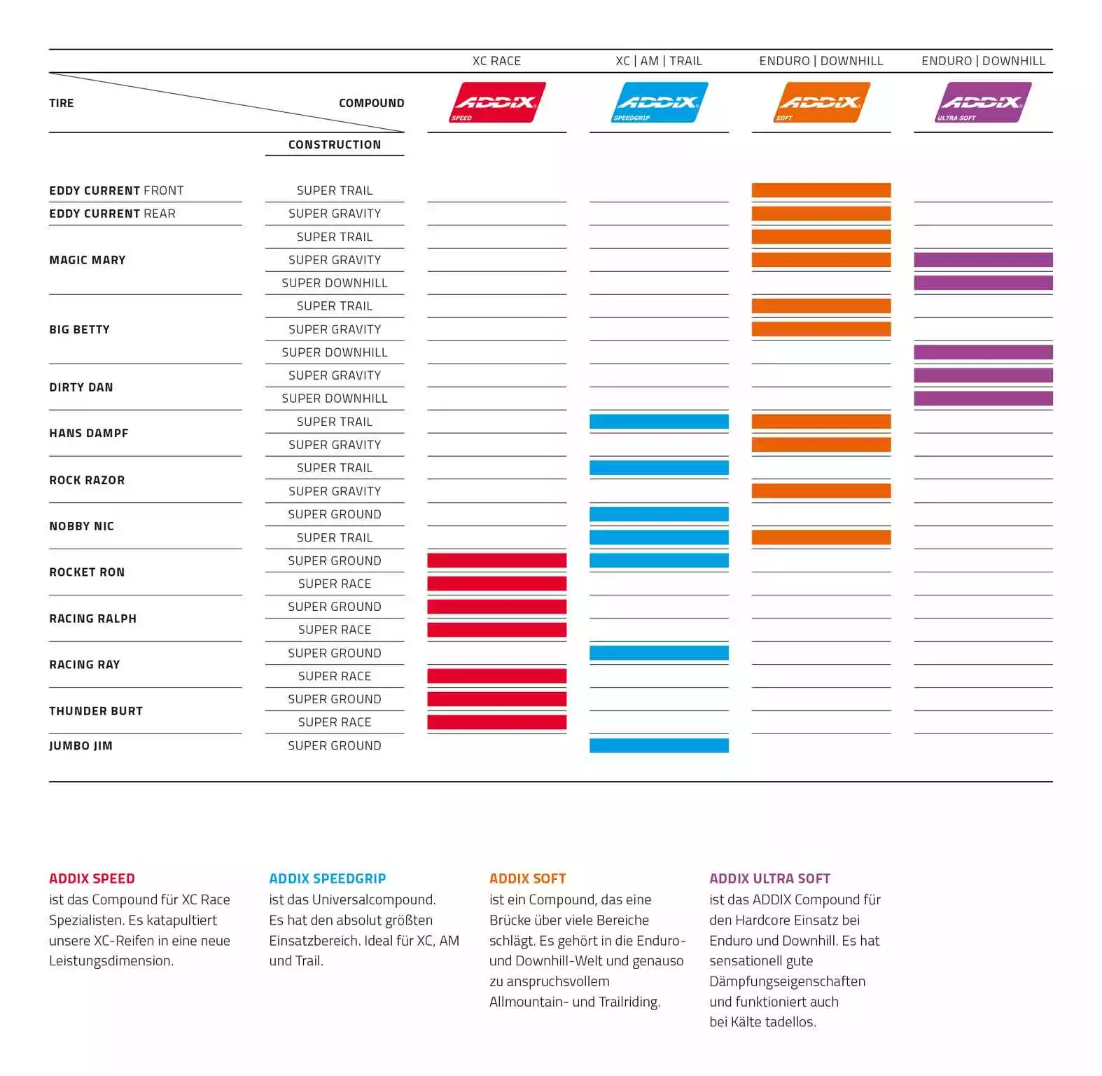 – Super Trail: Die vielseitigste Konstruktion, gebaut für Fahrspass von Allmountain bis Enduro. Zuverlässiger Pannenschutz gepaart mit einer hohen Seitenstabilität bei niedrigen Luftdrücken und extra verstärkten Seitenwände. Diese schützen vor Durchschlägen und dämpfen Schläge. Einsatzbereich: Trail und Enduro