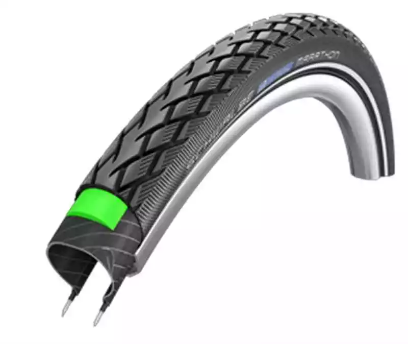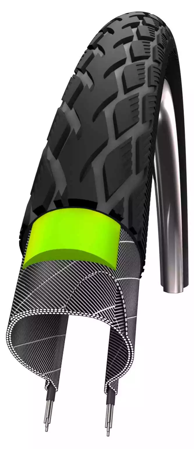 Das Original! Der MARATHON ist der Urvater aller hochwertigen Tourenreifen. Die jüngste Version des Klassikers ist mit dem neuen «GreenGuard»-Pannenschutz ausgerüstet. Diese 3mm starke Schutzschicht unter der Lauffläche besteht zu einem Drittel aus recycelten Latexprodukten und verhindert so das Eindringen von spitzen Gegenständen. Dennoch bleibt der Reifen geschmeidig und der Rollwiderstand relativ gering. «Anti-Aging» nennt Schwalbe die neu konstruierte Seitenwand, welche die Bildung von Rissen am Übergang zwischen Lauffläche und Profil verhindern soll. In Kombination mit der neuen «Endurance-Compound»-Gummimischung ergeben sich so ausgesprochen langlebige und belastbare Alltags- und Tourenreifen. Auch in Sondergrössen und Spezialmassen erhältlich! Drahtversion. Der neue MARATHON ist E-Bike-Ready und gemäss dem ECE-R75-Prüfzeichen zertifiziert und zugelassen für E-Bikes bis 50km/h. Inkl. Reflexstreifen und Dynamolaufrille. (RI)