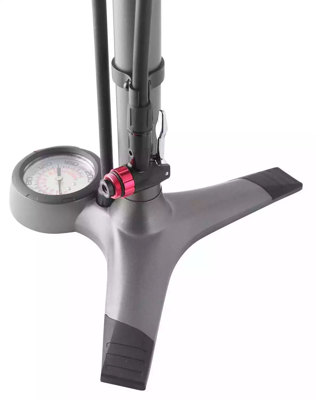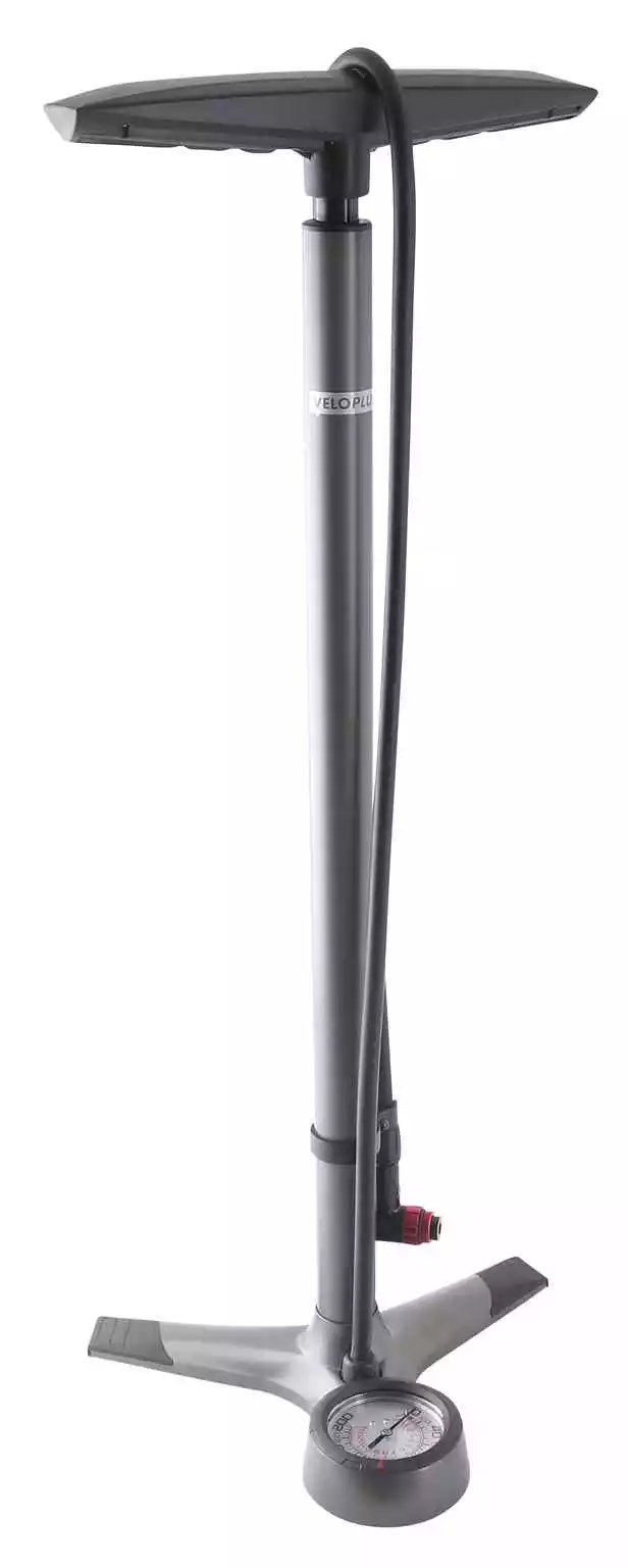 Elegante Standpumpe mit Schaft und Fuss aus leichtem Alu. Der robuste Alu-Pumpadapter mit verwindungssteifem Kipphebel ist einfach an den gängigen Velo-Ventilen (Presta, Dunlop sowie Schrader) anzulegen und verfügt über ein praktisches Ablassventil zur Druckreglierung.