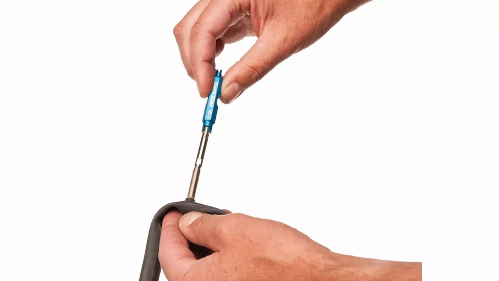 Ein kleines, handliches Werkzeug zum Aus- und Einbau von Schrader- und Presta-Ventilkernen und zum Aus- und Einbau von Presta-Ventilverlängerungen mit 5 mm Schlüsselflächen.