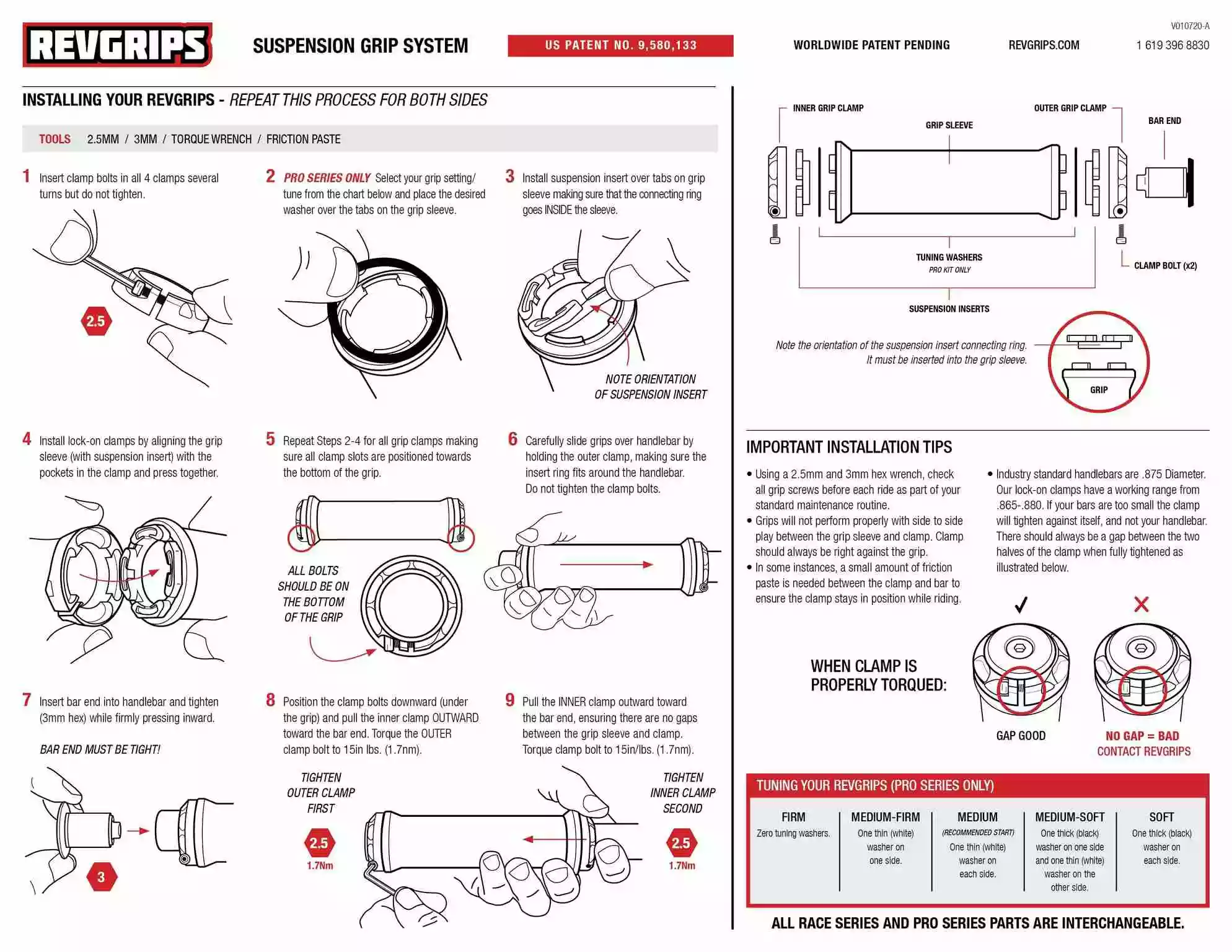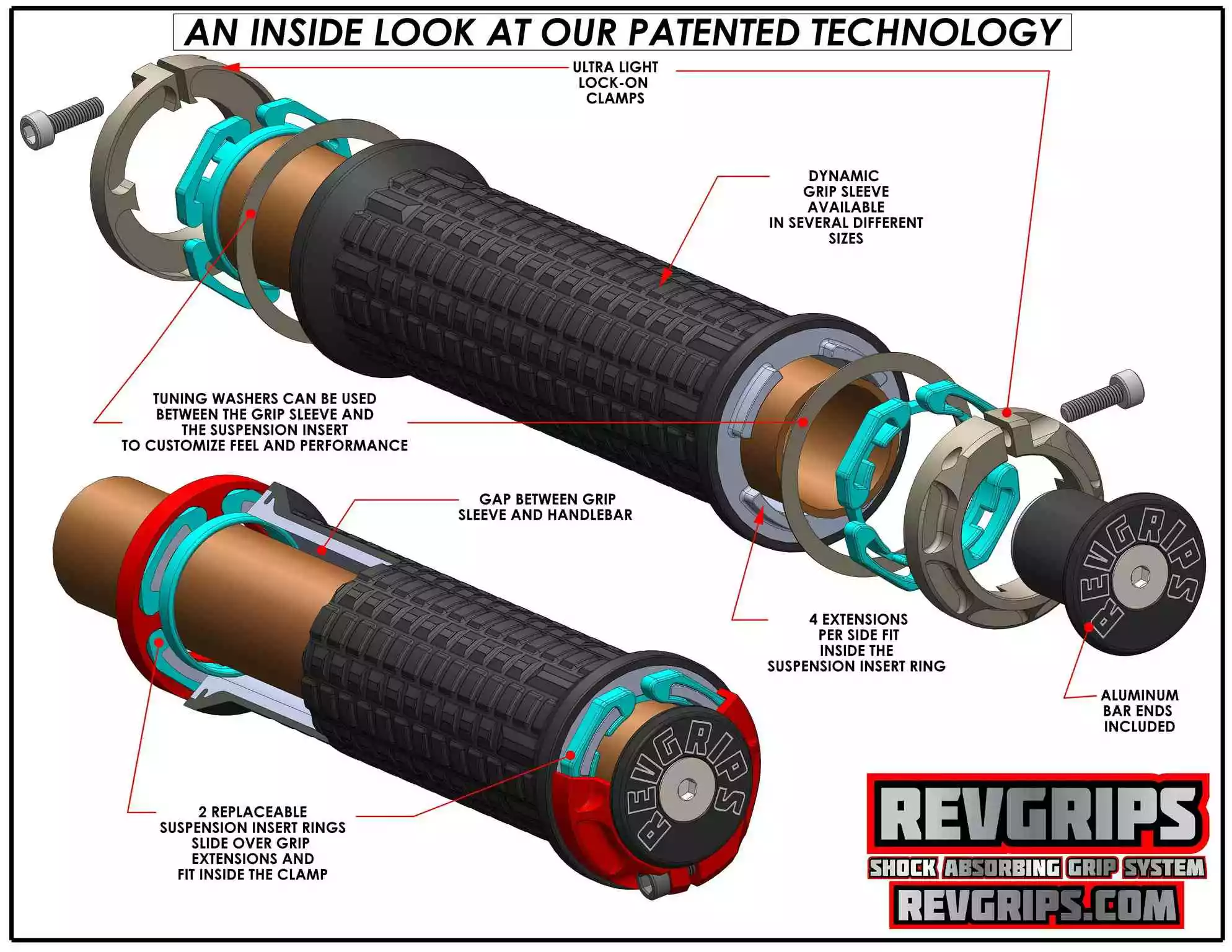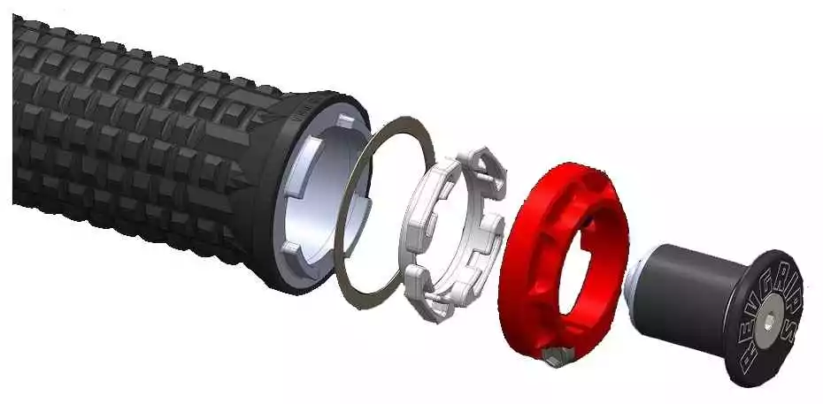 Der patentierte Revgrip wurde so aufgebaut, dass die Griffe entkoppelt vom Lenker über Gummiringe gelagert sind. So kann dieser in alle Richtungen leicht bewegt werden und dadurch sehr effektiv Vibrationen an den Händen reduzieren.