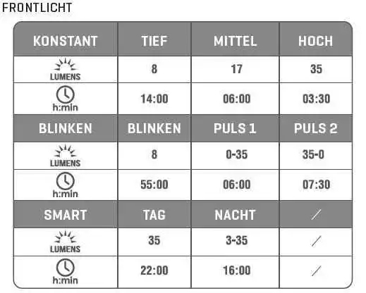 – 35 Lumen (Front), 30 Lumen (Rücklicht)