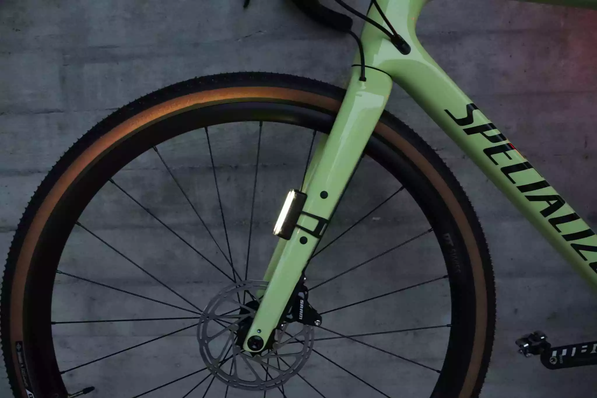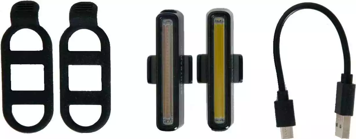 Das Positionslichtset Sichtbar Mini Combo ist der ideale Alltagsbegleiter in Sachen Sichtbarkeit und eignet sich auch ideal für inzwischen von der Tagfahrlicht betroffene E-Bikes. Die 35 Lumen starke Frontlampe und das 30 Lumen starke Rücklicht bieten mit einem 230 Grad breiten Abstrahlwinkel auch optimale seitliche Sichtbarkeit im Strassenverkehr. Zusätzlich integriert ist ein Umgebungslichtsensor, der im Smart-Modus-Betrieb automatisch die Lichtstärke zwischen Tag- und Nachtmodus steuert, sowie ein automatischer Stromsparmodus, der sich bei niedrigem Akkustand aktiviert. Das wasserdichte Lichtset (IPX6-Norm) brilliert mit seiner Akkulaufzeit, die eine Betriebszeit von bis zu 40 Stunden zulässt. Es wird innert Sekunden mit den mitgelieferten Gummistraps befestigt und ist gerade einmal 44 Gramm schwer. Falls man diese Positionslichter mal in Rucksack oder Tasche mitnimmt, kann man die Gummistraps bequem um die Lichter legen (siehe Bild 3). Im Transportmodus hält so alles schön zusammen und auch die Ladebuchsen-Abdeckung ist am Licht befestigt.
