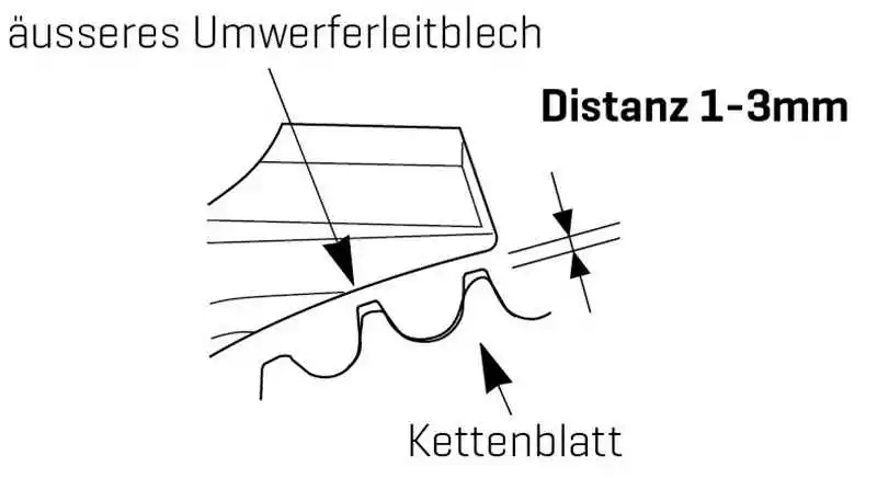 Umwerfer so einstellen, dass die Distanz des äusseren Umwerferleitlblechs zum Kettenblatt 1-3mm beträgt.