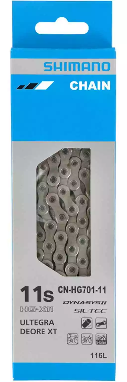 11fach Kette für XT MTB und ULTEGRA Rennveloantrieb. Beachten Sie die Montageanleitung. Die Seite mit beschrifteten Laschen ist nach aussen zu montieren.